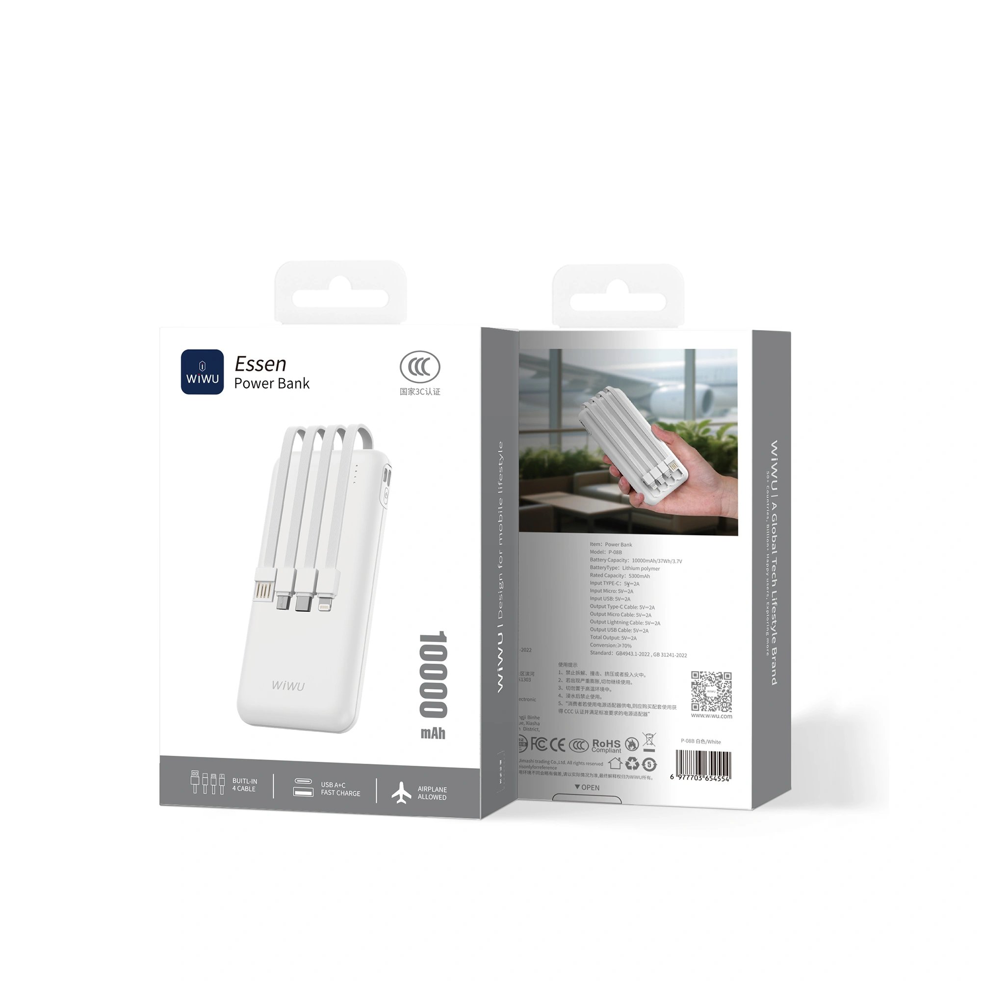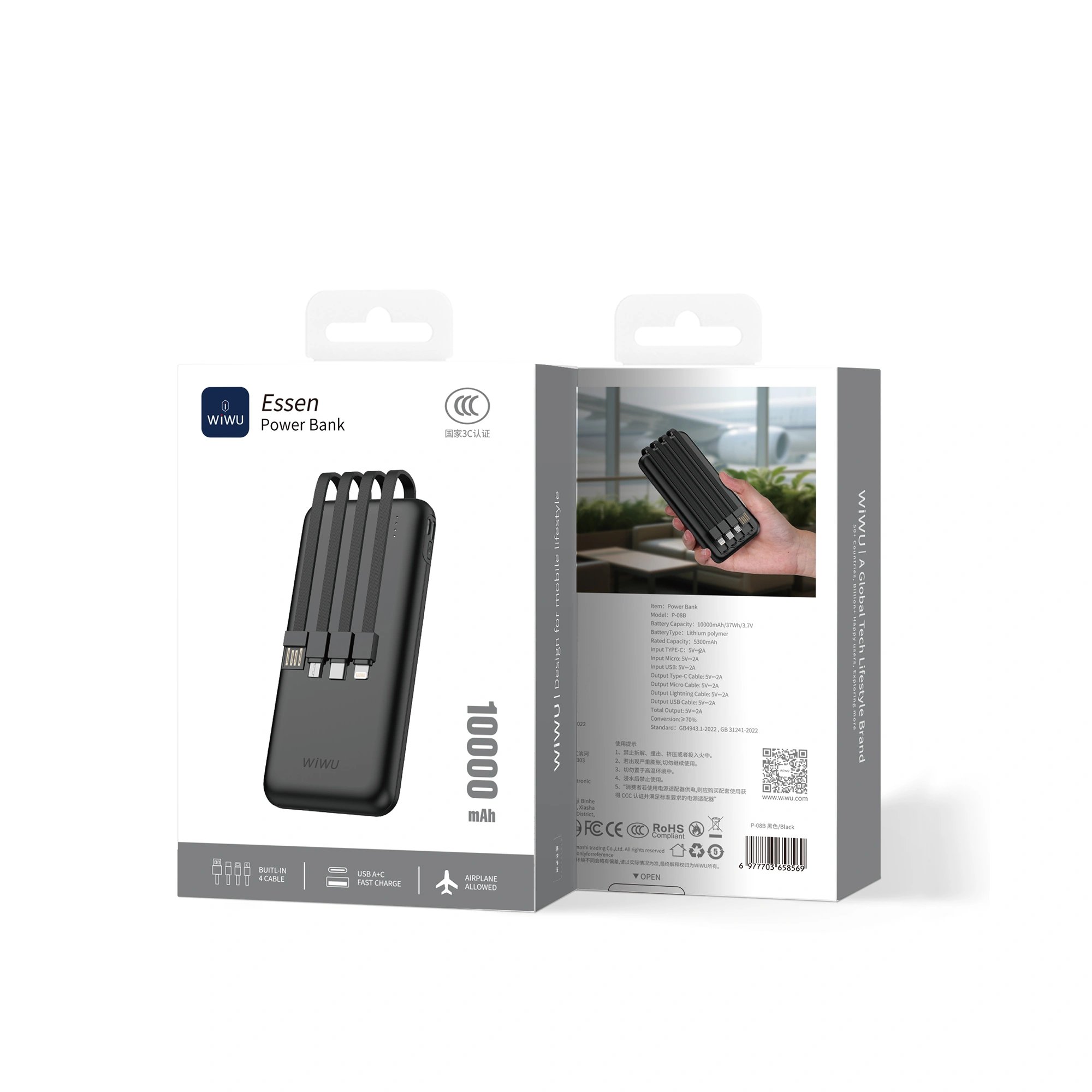 Home›Shop›Gadgets & Lifestyle›Power Bank›WiWU Essen P-08B 10000mAh Black 12W Power Bank with Built-in 4 cables